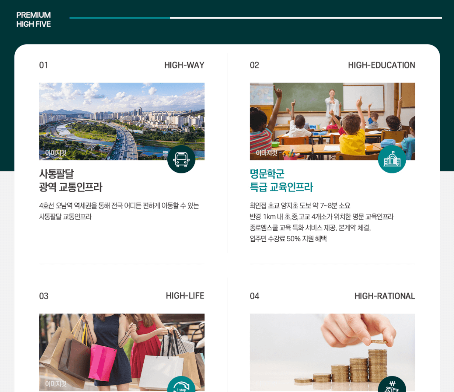 주변으로 양지초, 오남중, 오남고가 위치하고 있어 어린이집부터 초·중·고교까지 안전한 도보통학이 가능한 ‘원스톱 학세권’을 갖추고 있으며, 주변 학원가와 시립오남도서관, 시립진접푸른숲도서관 등 자녀 안심 교육여건을 갖추고 있어 우수한 교육환경을 자랑합니다.